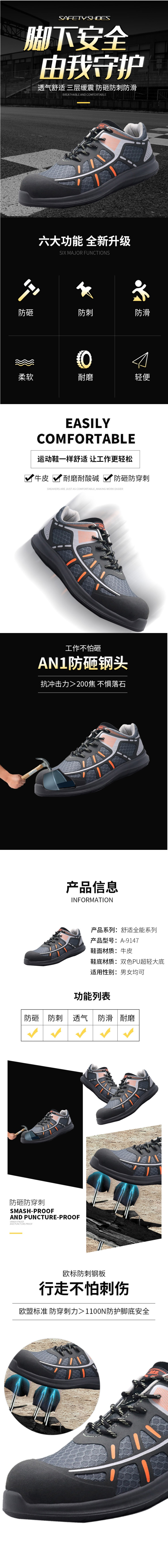 安步塔 A-9147 双色PU超轻大底 蜂窝透气网布安全鞋