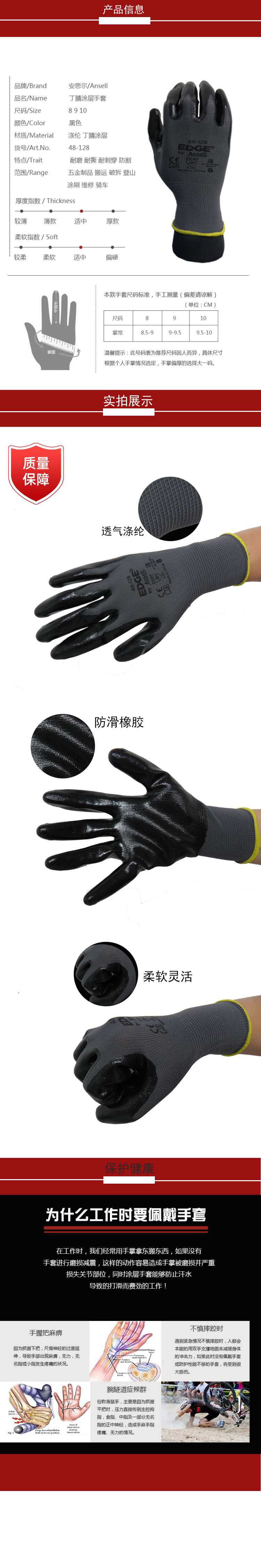 ANSELL 48-128丁腈一次性手套 防滑可选 加厚化工防护手套 黑色